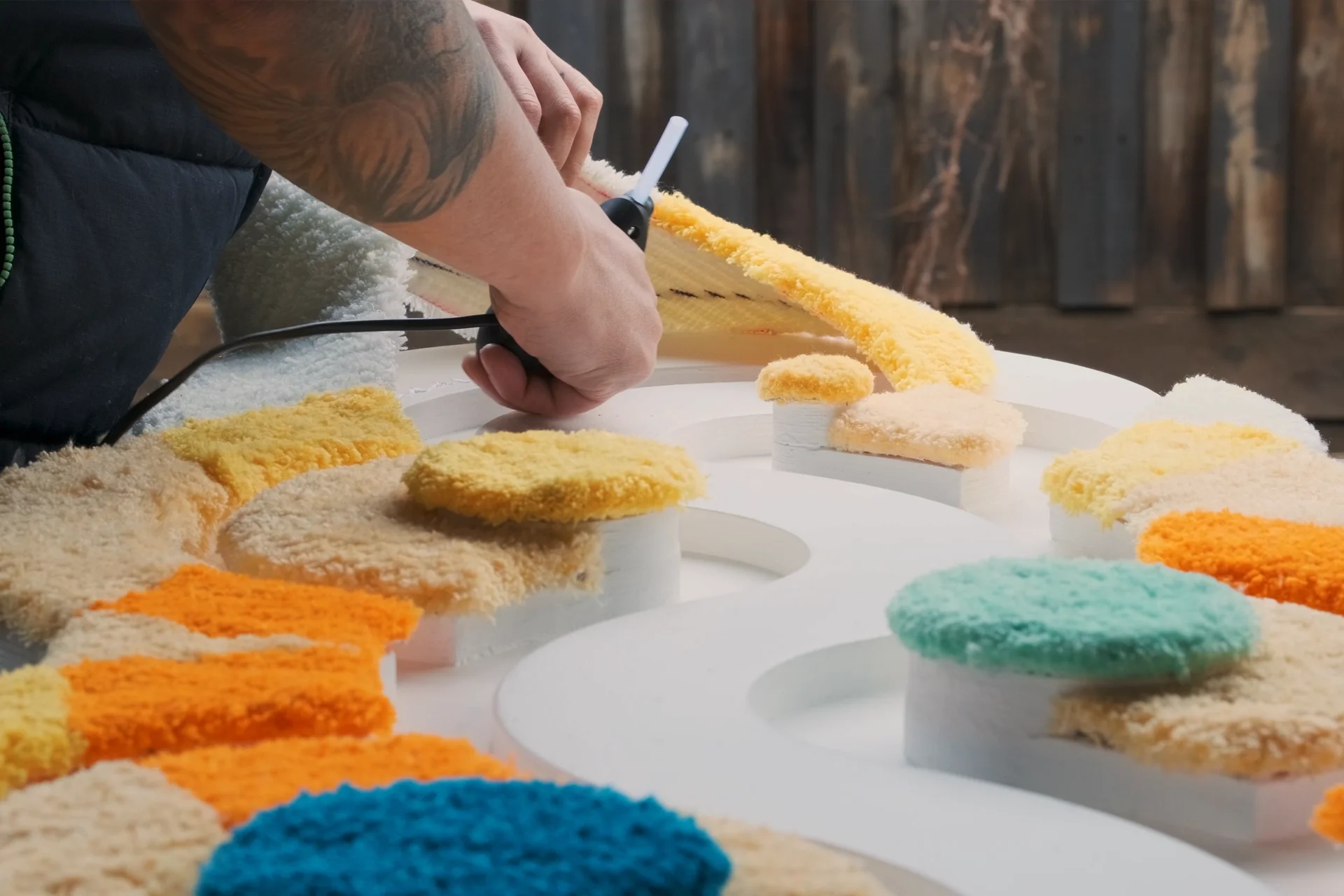 The artwork was developed through a rich, multi-layered collaboration between Marcus Lee Design, Tuft and Touch Studio’s textile artist, and UnitedMake’s design and fabrication team.