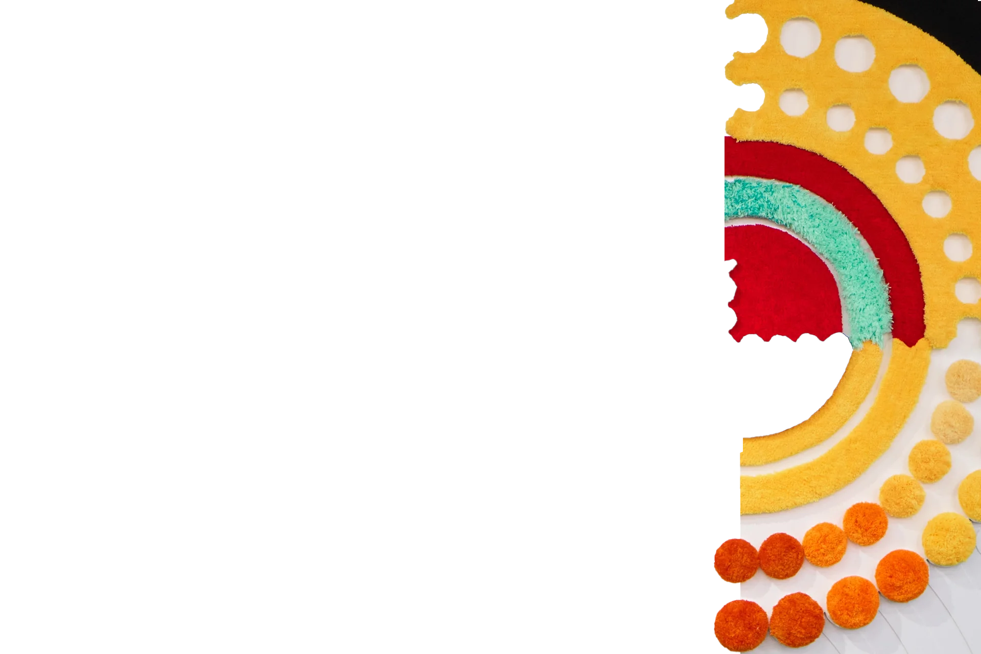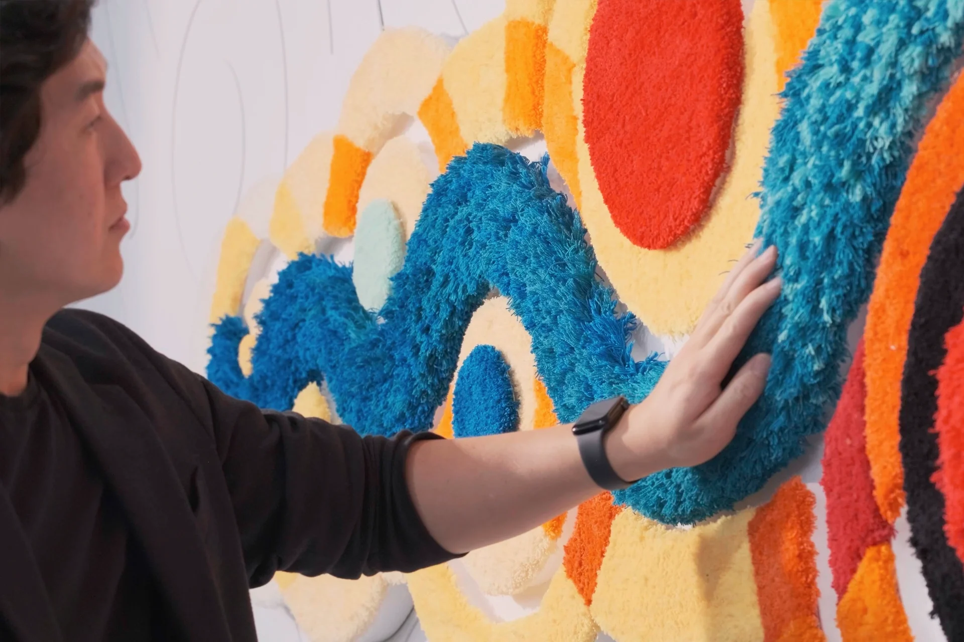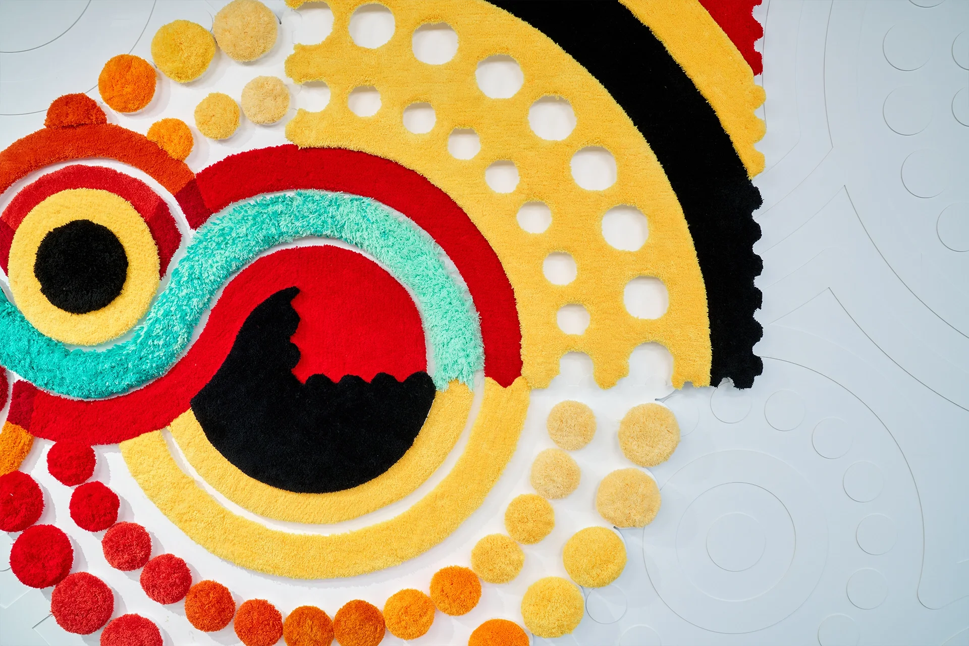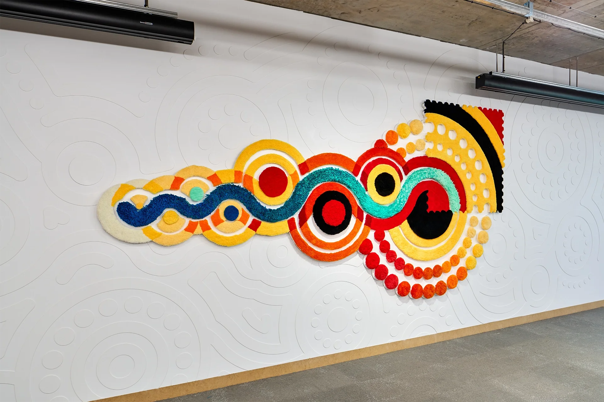 Over four months, Tuft and Touch Studio produced the vibrant tufted panels by hand in their North Melbourne studio, exploring new methods of gradient blending and colour transitions. Each section was later assembled and mounted by UnitedMake onto a custom backing board designed to preserve the tactility and dimensionality of the textile.