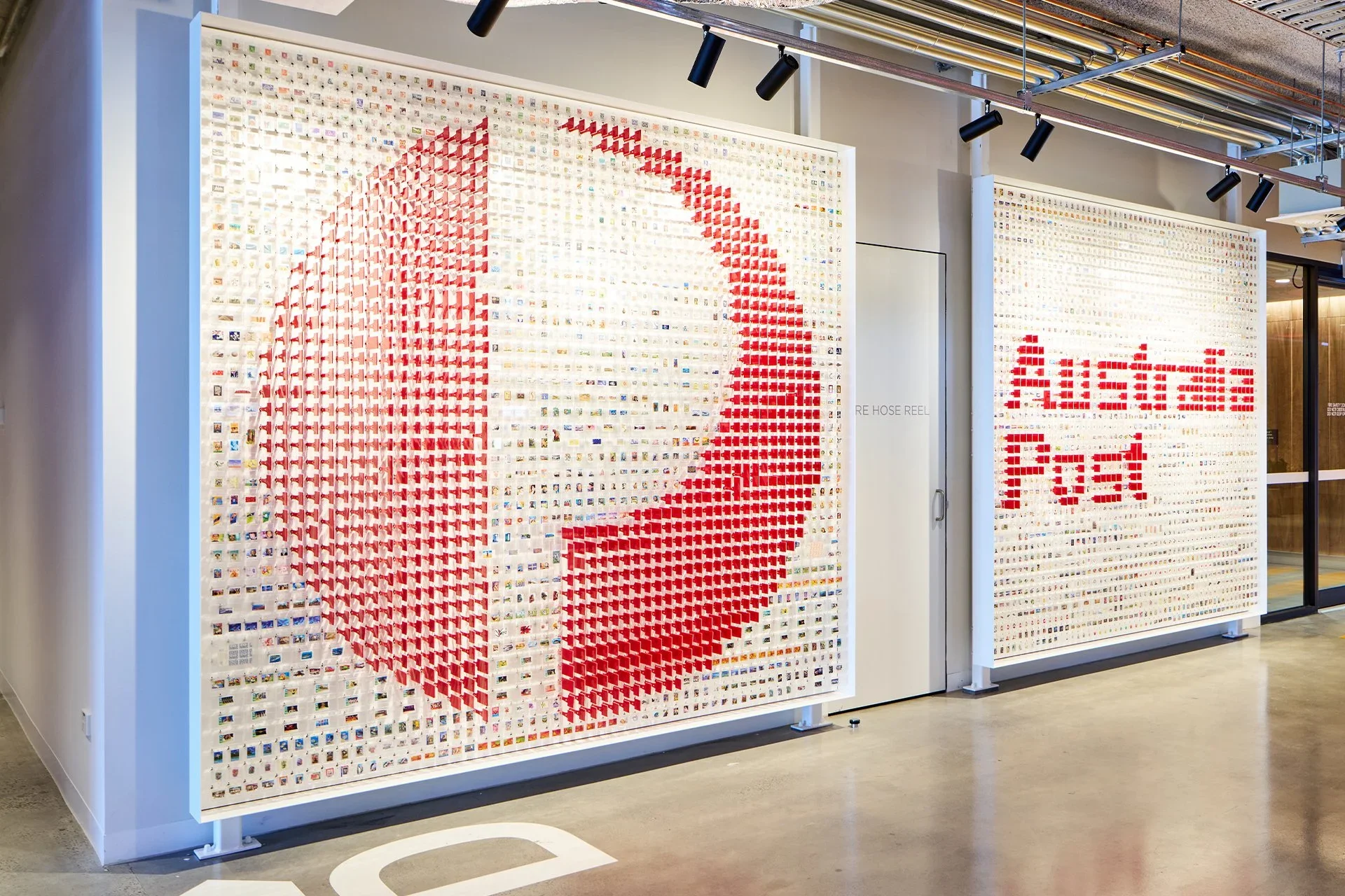Stretching across the central foyer of Australia Post’s Melbourne Support Centre, the piece reinterprets the nation’s story through the miniature artworks that once travelled across oceans and generations. Seen up close, each stamp reveals individual craftsmanship and cultural moments; viewed from afar, they coalesce into a single image, the Australia Post logo - symbolising the collective identity that holds these stories together.